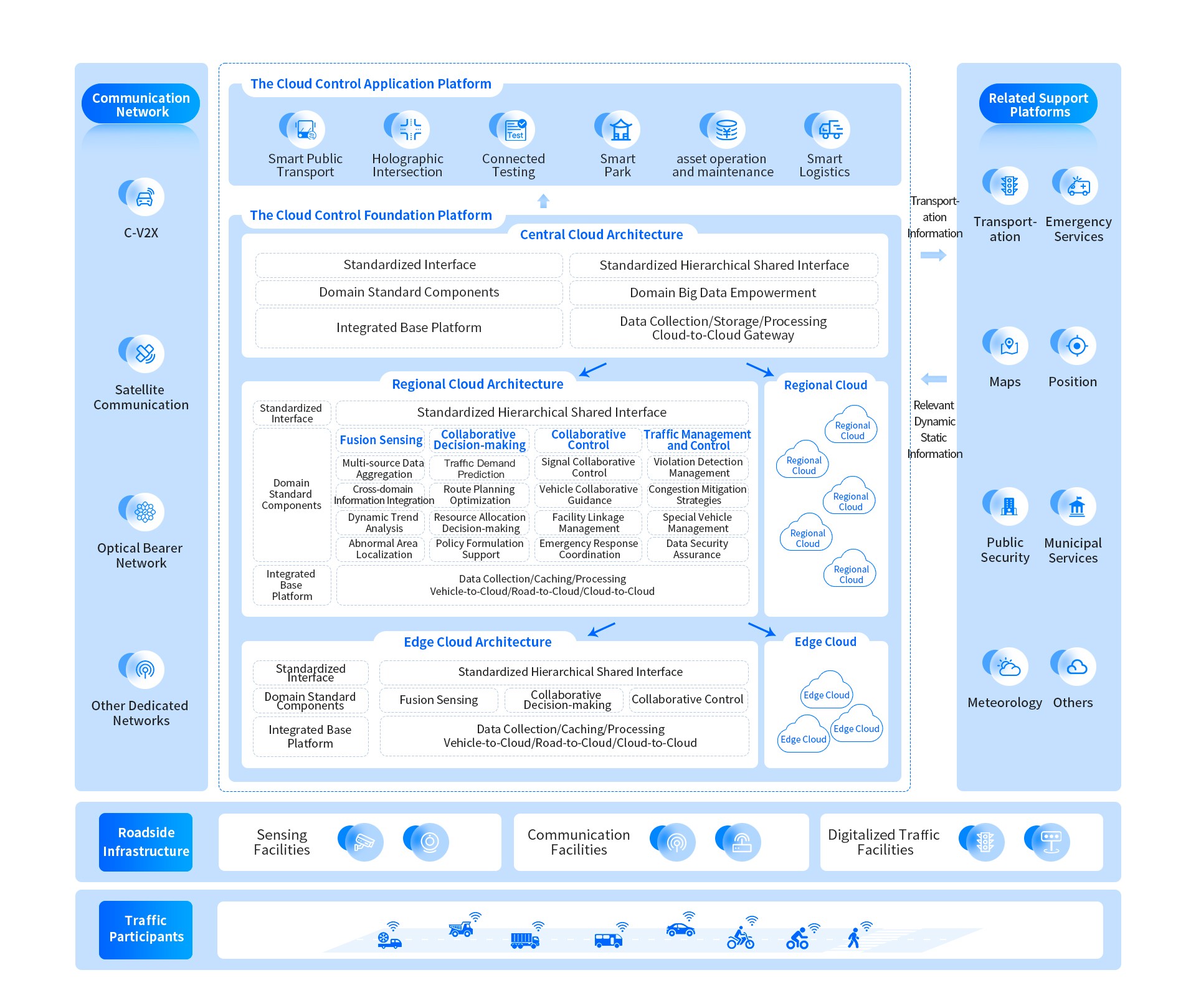 The Cloud Control Platform aims to connect elements such as"vehicles,roads,clouds,networks and maps"providing unified informatization and digital management for vehicle operations,roadside infrastructure,traffic conditions and events. It enables intelligent collaboration and management decision-making among people,vehicles and roads.